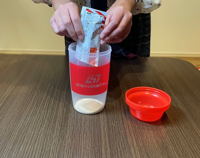 ① まずはシェイカーと個包装されている「DR.SENOBIRU」を用意します